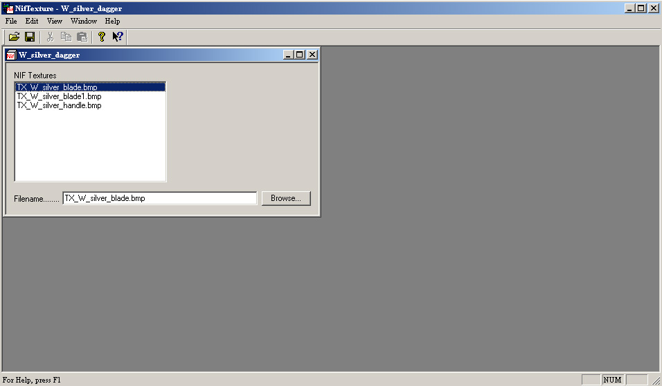Now, we have our textures, but we need to apply them to the mesh. Go back to NIFtexture and open the silver dagger, click on TX_W_silver_blade and the select ‘browse from the bottom corner. Now, find your file (it should be on your desktop, so select desktop and then double click on your file. Now the name TX_W_silver_blade should be replaced with (in my case) B1_silver_blade (yours should be different, at least if you release the mod, please change it). Now, repeat the steps for the other two bmps listed.